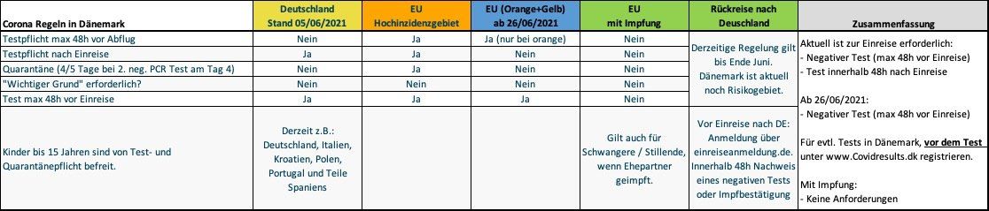 In der Tabelle findet ihr aktuelle Einreisebedingungen für Deutschland nach Dänemark und auch was ihr bei der Rückreise beachten müsst. Alles ist Stand heute (5.6.2021) aber auch im Hinblick auf die EU-weiten Änderungen, die am 26.6.2021 in Kraft treten. Bitte meldet Euch, wenn irgendetwas nicht klar ist! Wir freuen uns auf Euren Besuch!!!