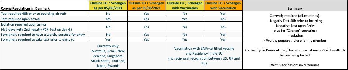 Please find below an overview of the current travel restrictions as per June 5th, 2021 for countries that are outside of the EU/Schengen. This applies to UK, USA etc. Whether these restrictions will change is unclear at this point. Please note that Vaccination Passes for outside EU countries are not accepted yet - hence the requirement to self-quarantine and test before boarding the flight (48hours prior to boarding) and testing when in Denmark. Once updates come through, we will post them of course!